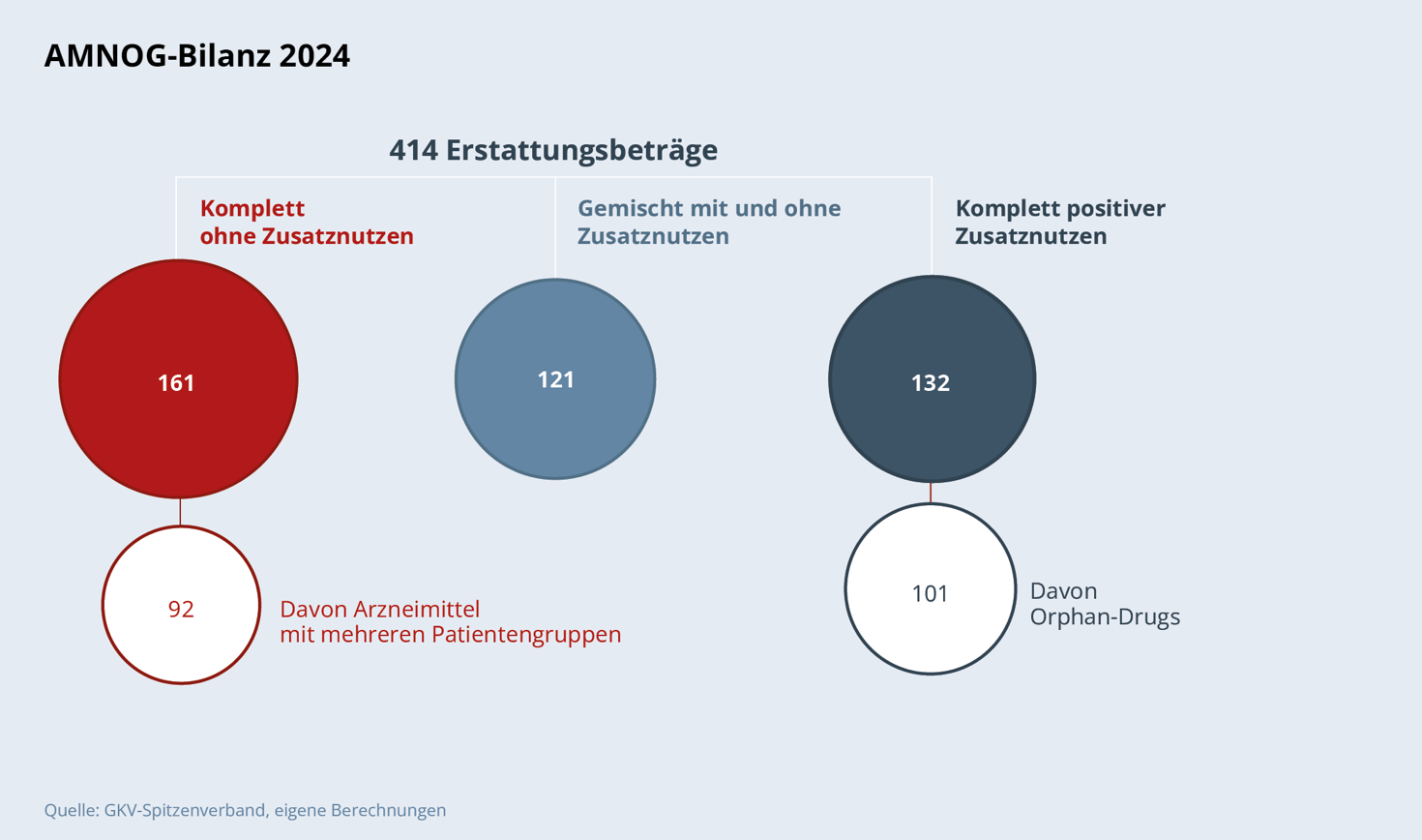Zum Jahresende 2024 existierten zu 414 Wirkstoffen Erstattungsbeträge. Davon wurden 384 durch Einigung der Vertragsparteien erzielt, 29 Verfahren endeten mit einem Spruch der Schiedsstelle. 20 zunächst mit einem Erstattungsbetrag geregelte Wirkstoffe wurden in bestehende Festbetragsgruppen eingeordnet.